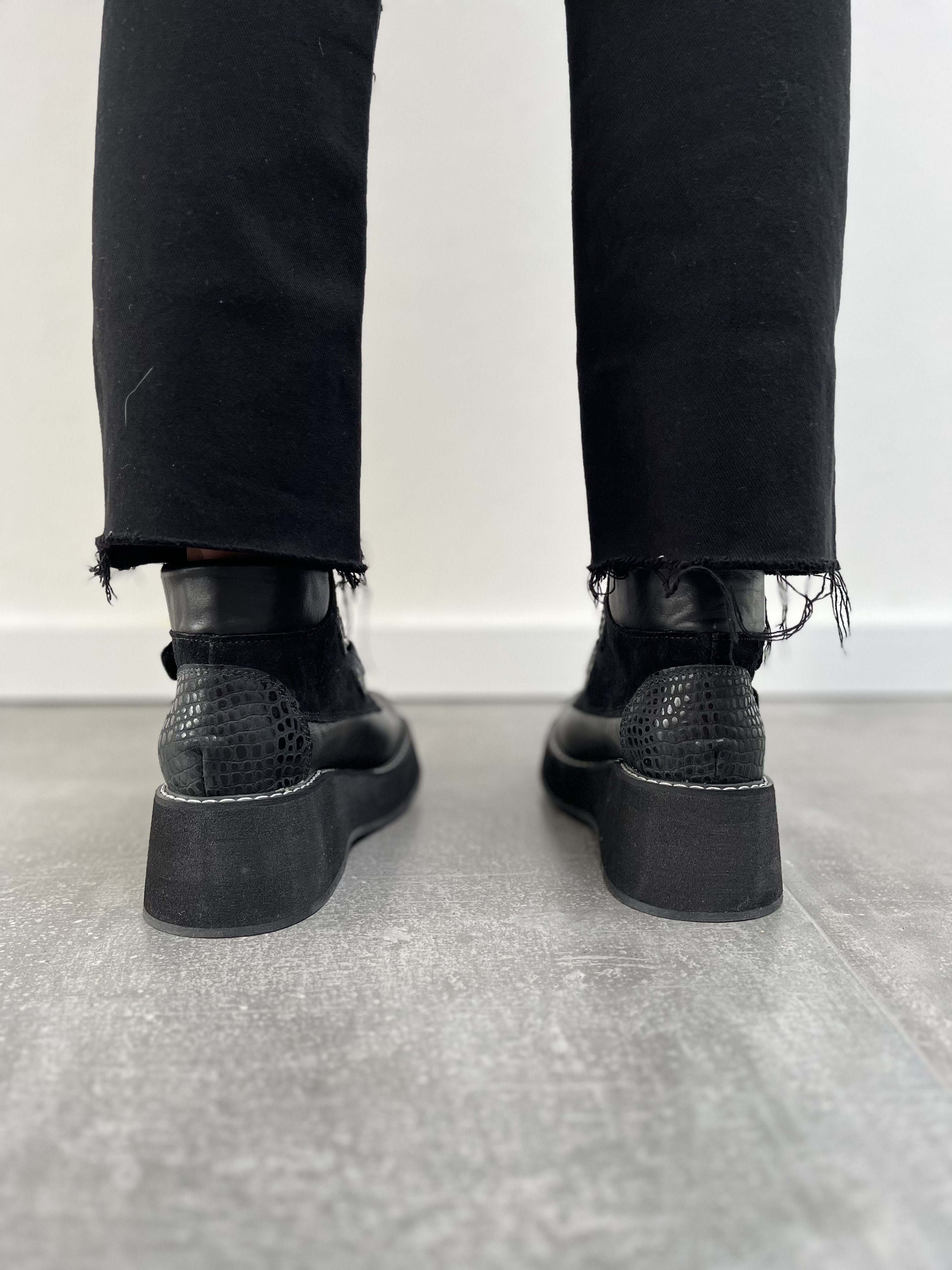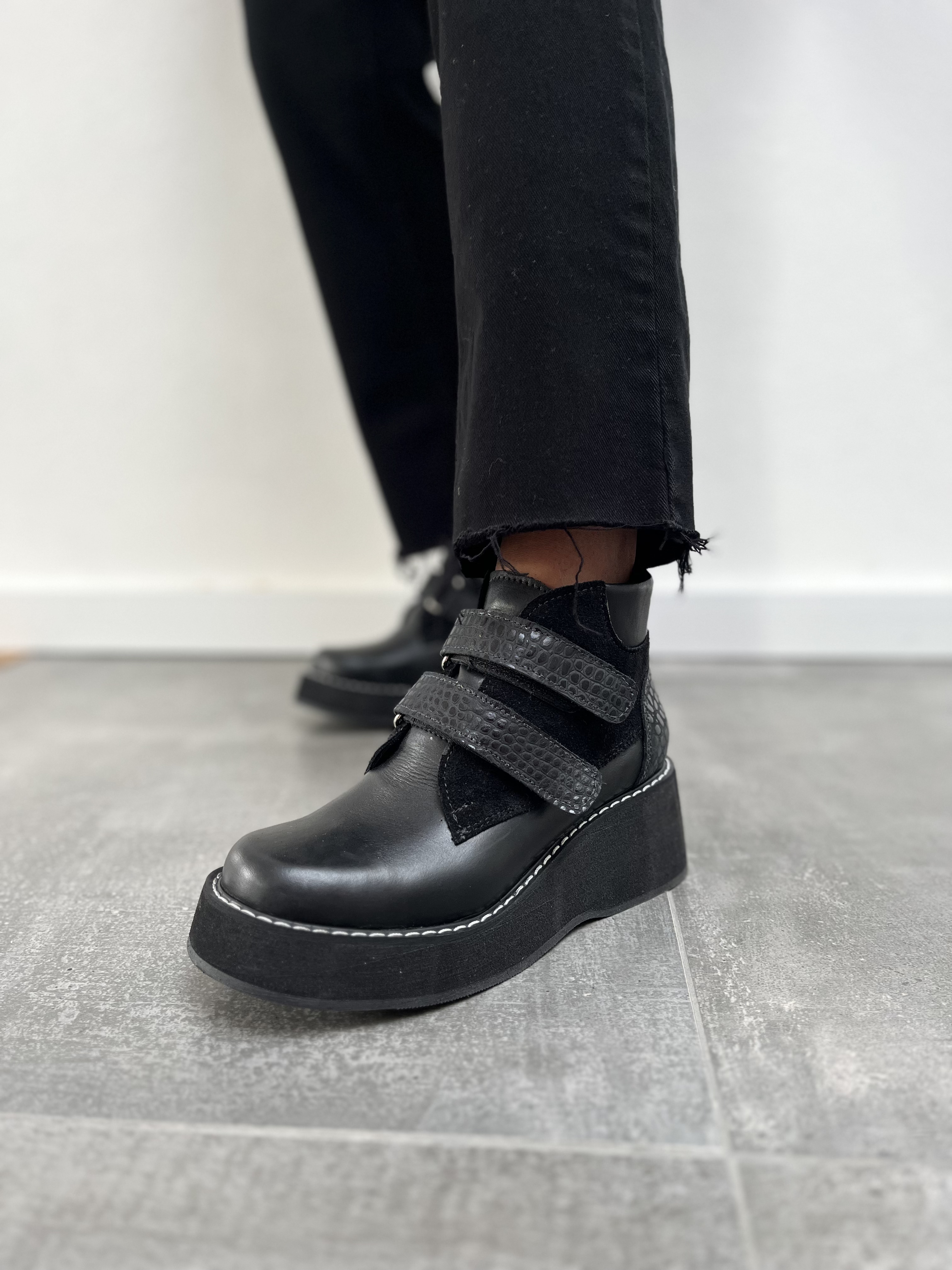 Bota con plataforma corrida y velcro. Realizada en cuero, industria uruguaya.