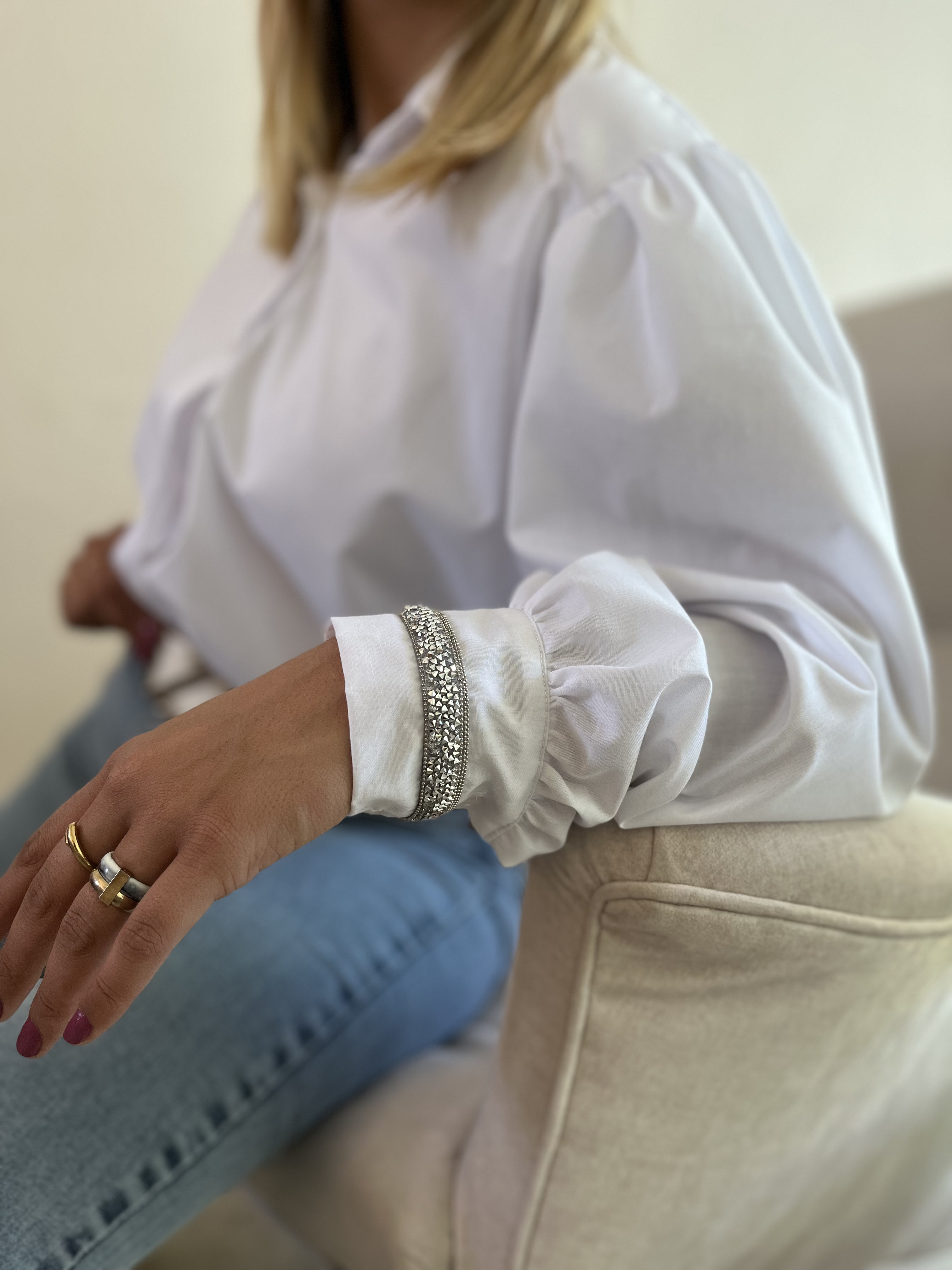 Camisa diseñada y confeccionada por Grace con apliques en plateado sobre sus puños. Manga globo, talle único.