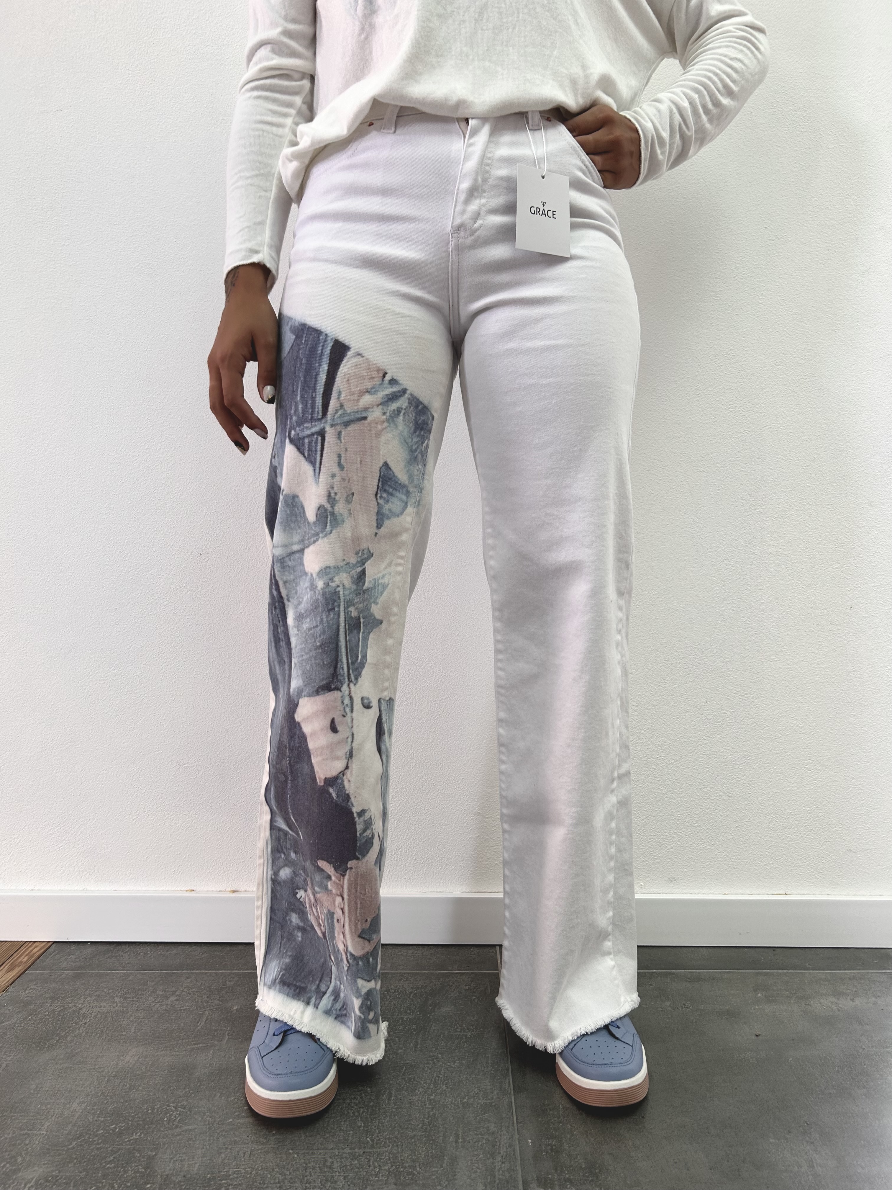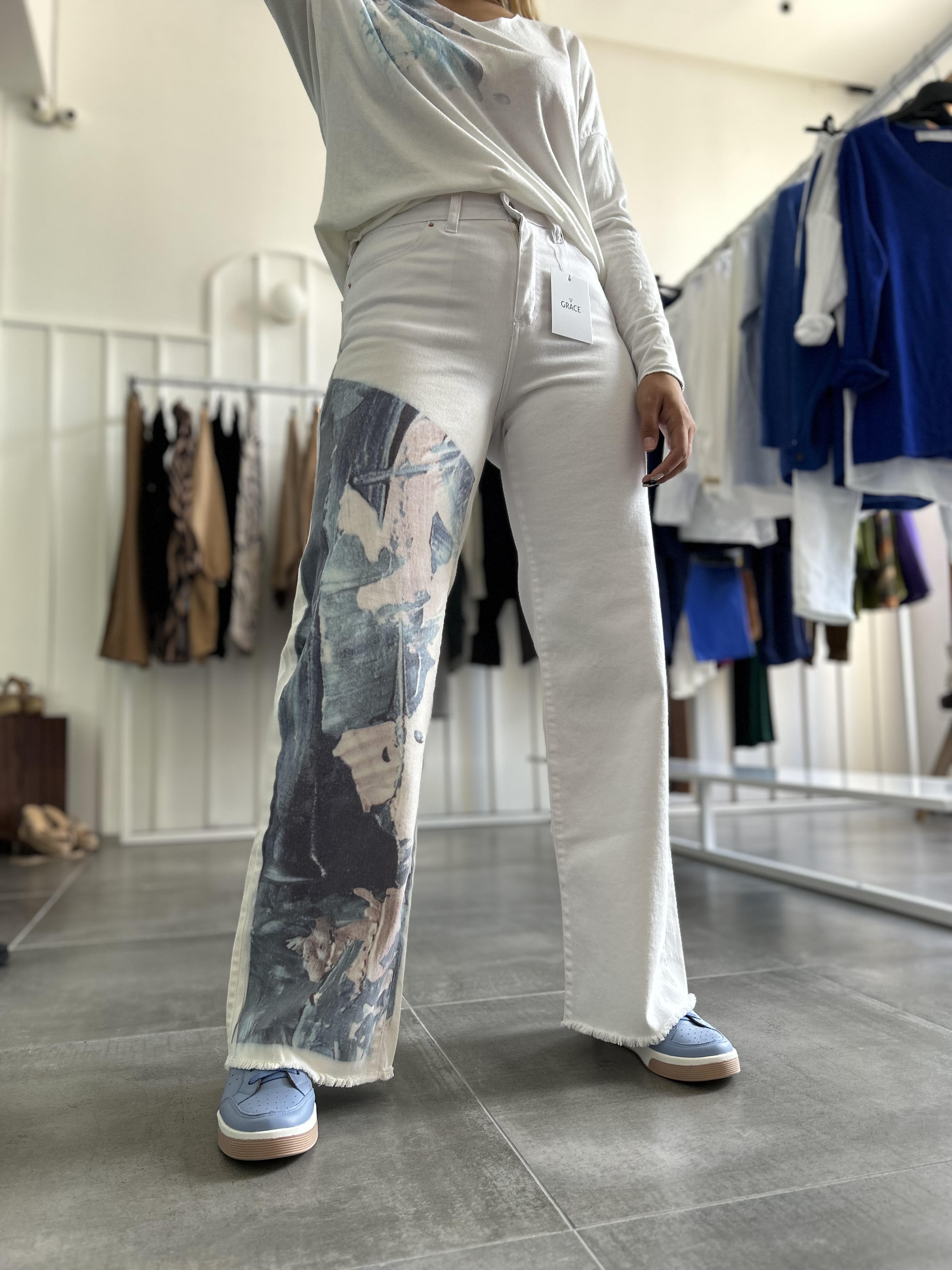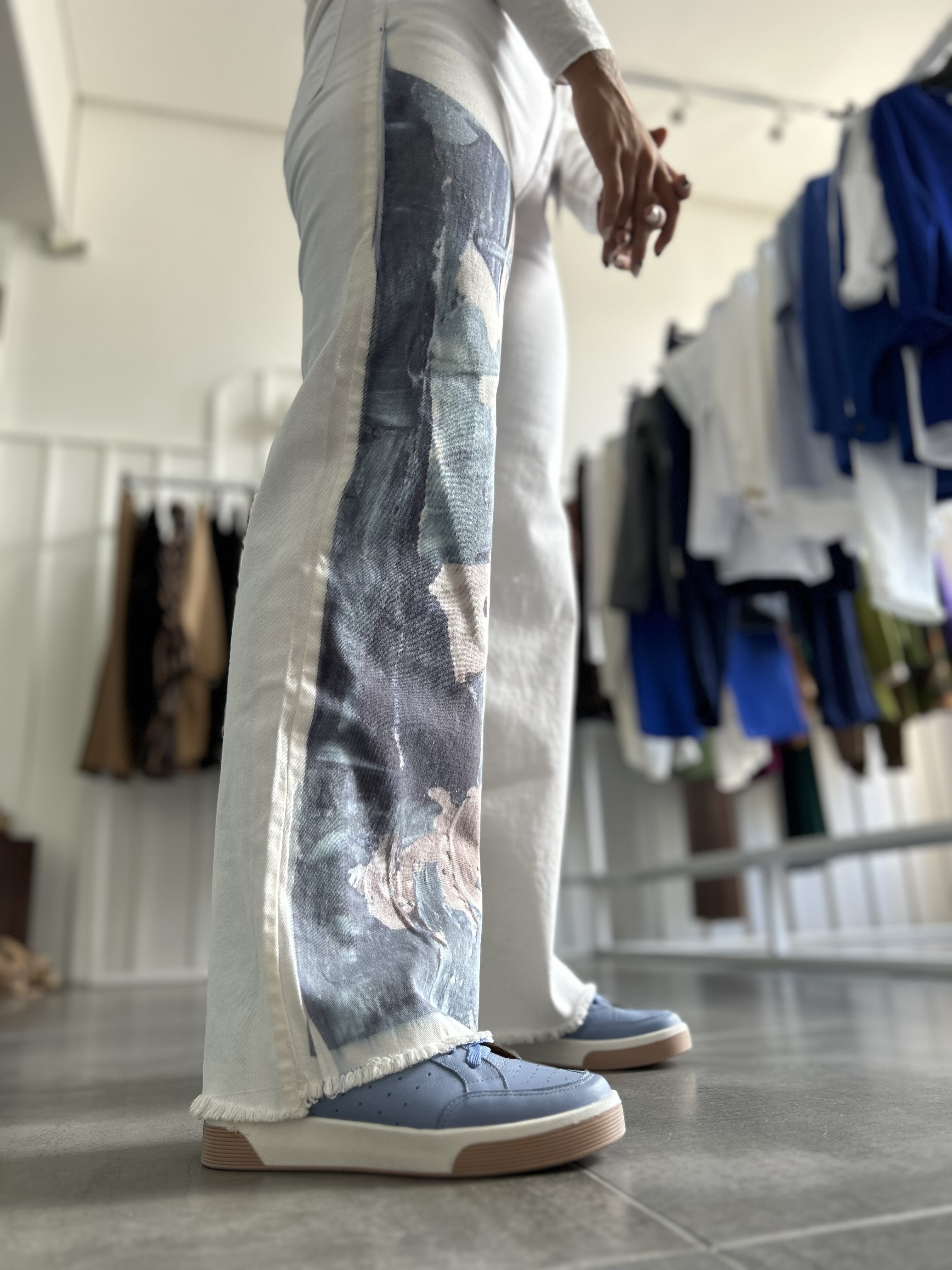 Pantalón de jean, tipo culotte intervenido artísticamente.