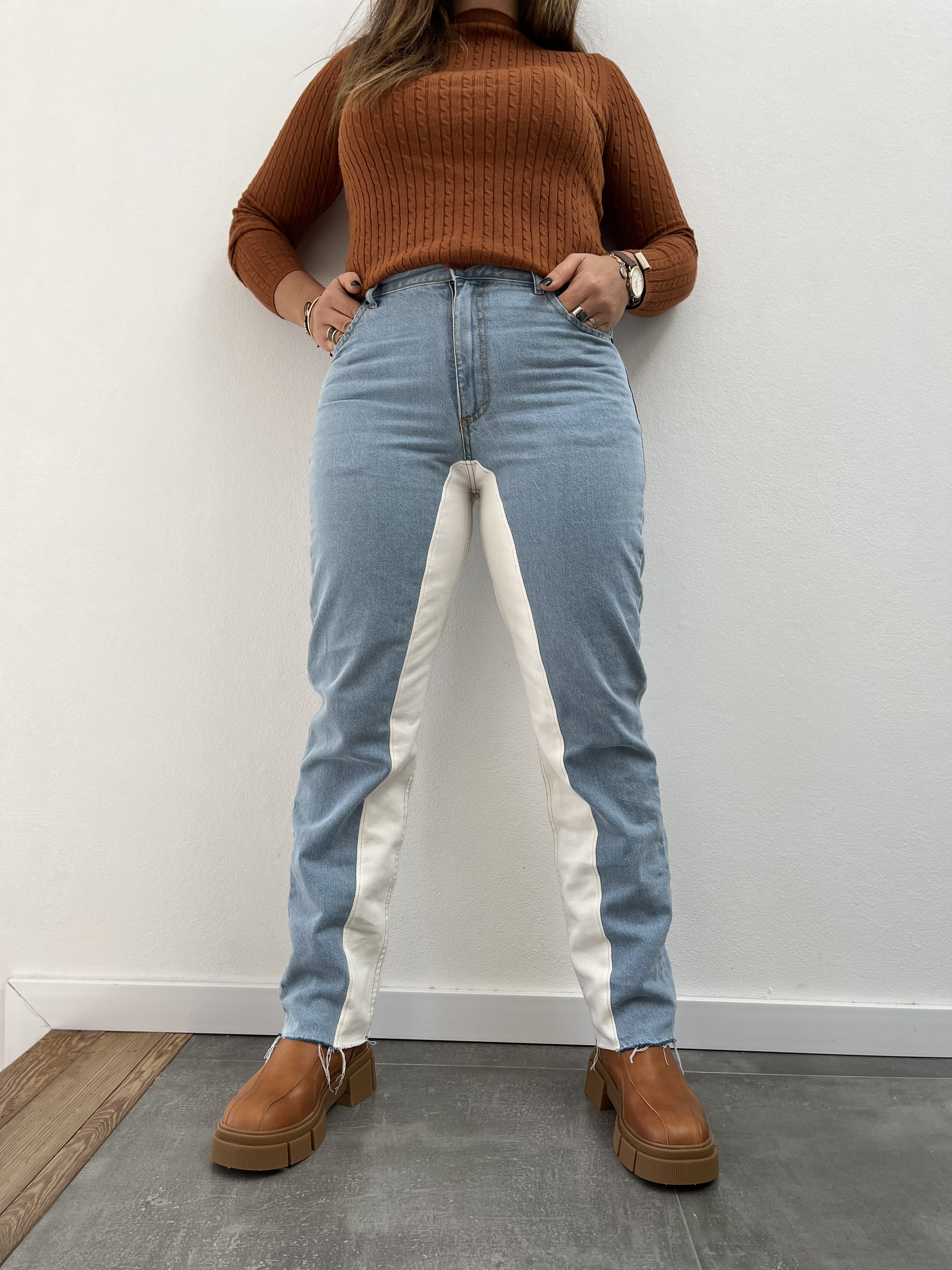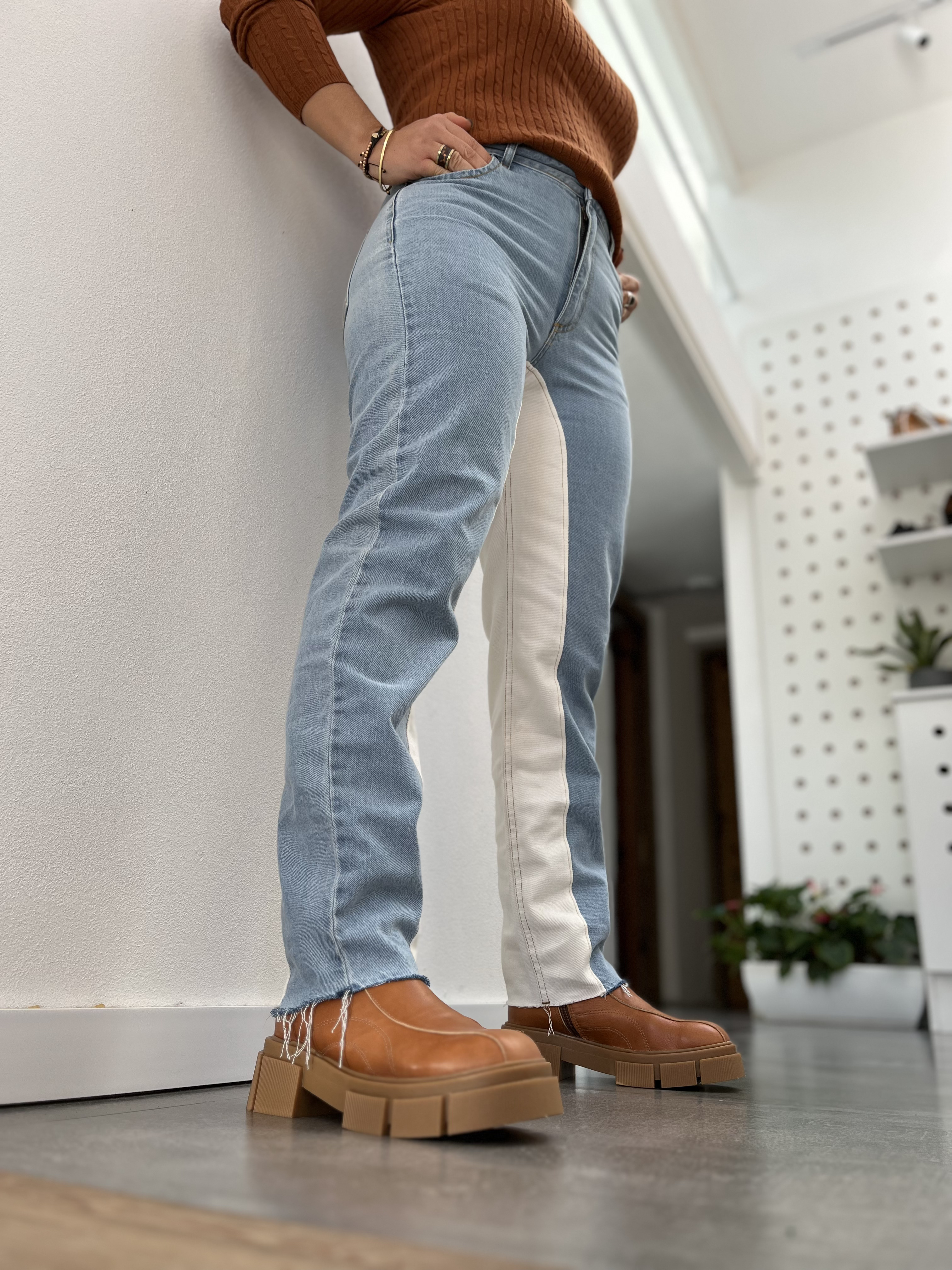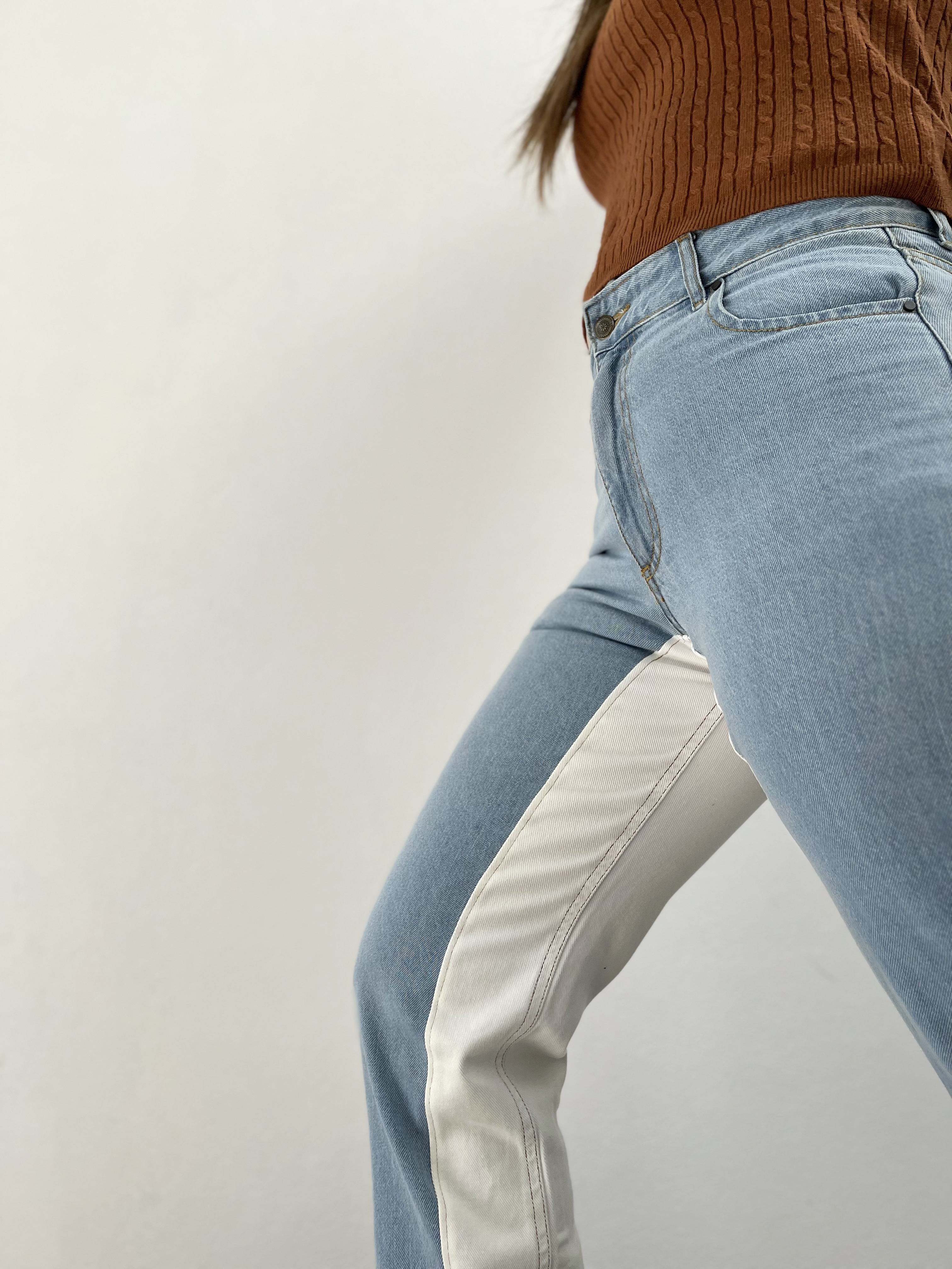Pantalón de jean tipo mom, realizado con patch de dos pantalones distintos. Diseño exclusivo de nuestra cápsula UPCYCLING.
