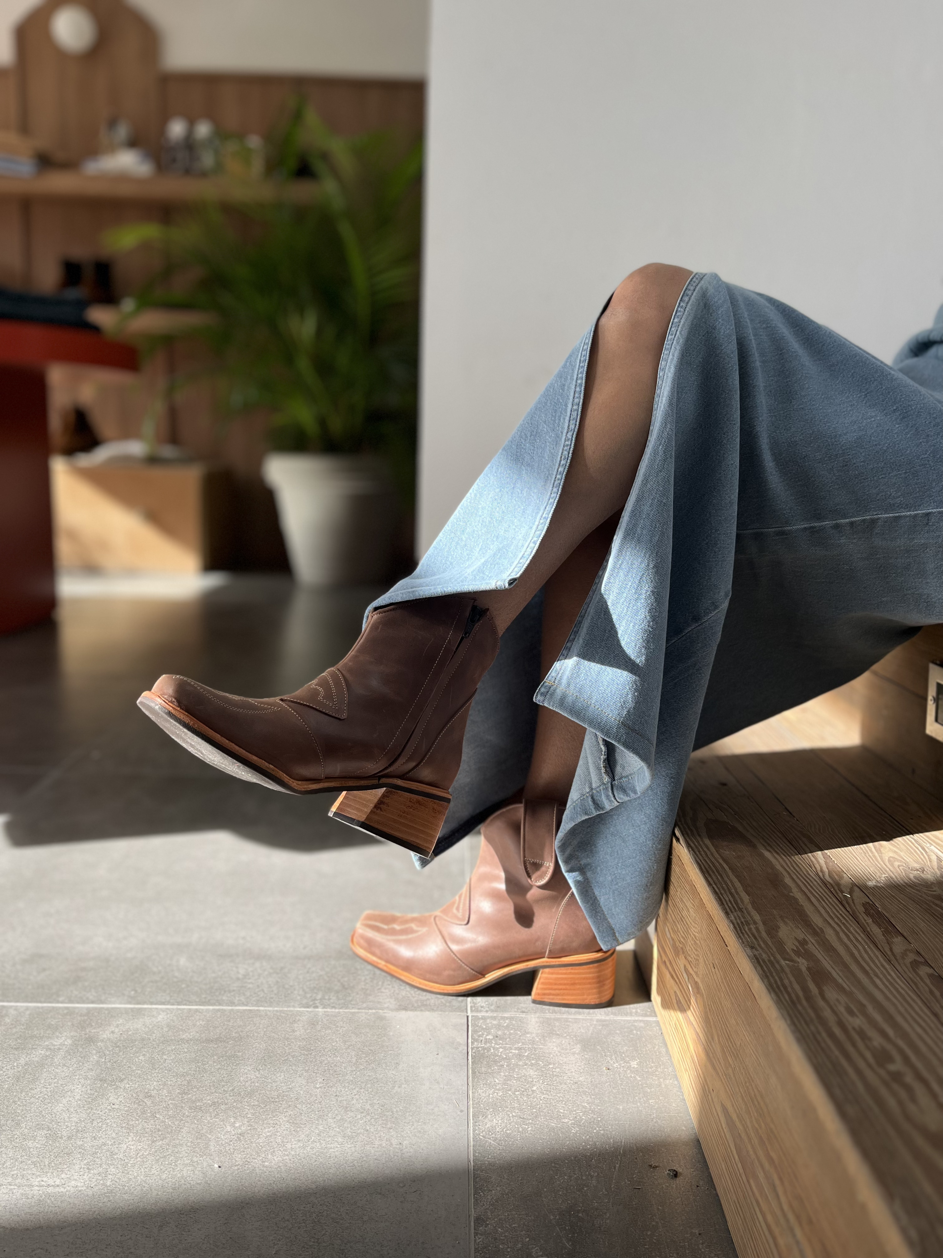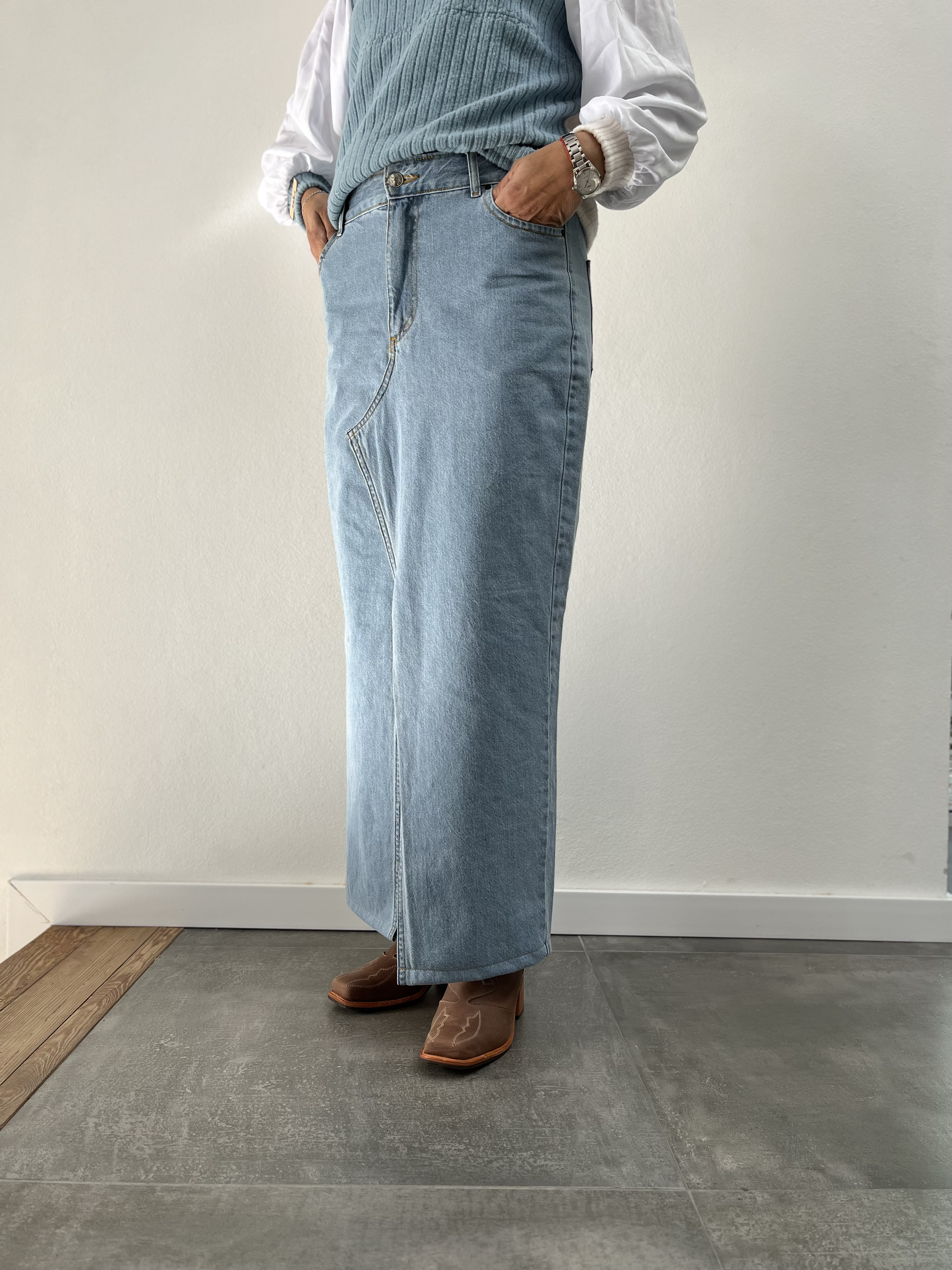 Pollera de jean con tajos, realizada con textiles en desuso.