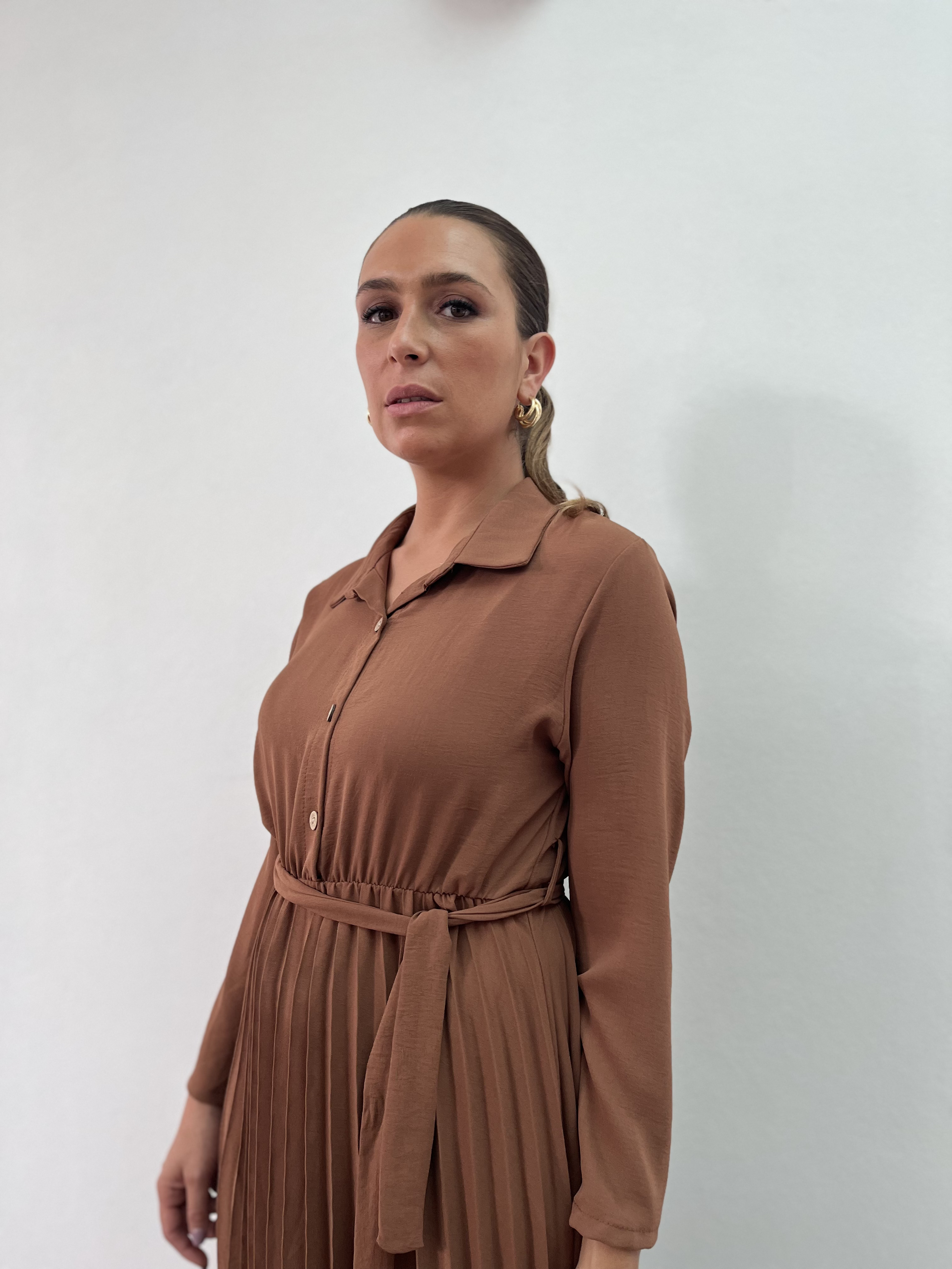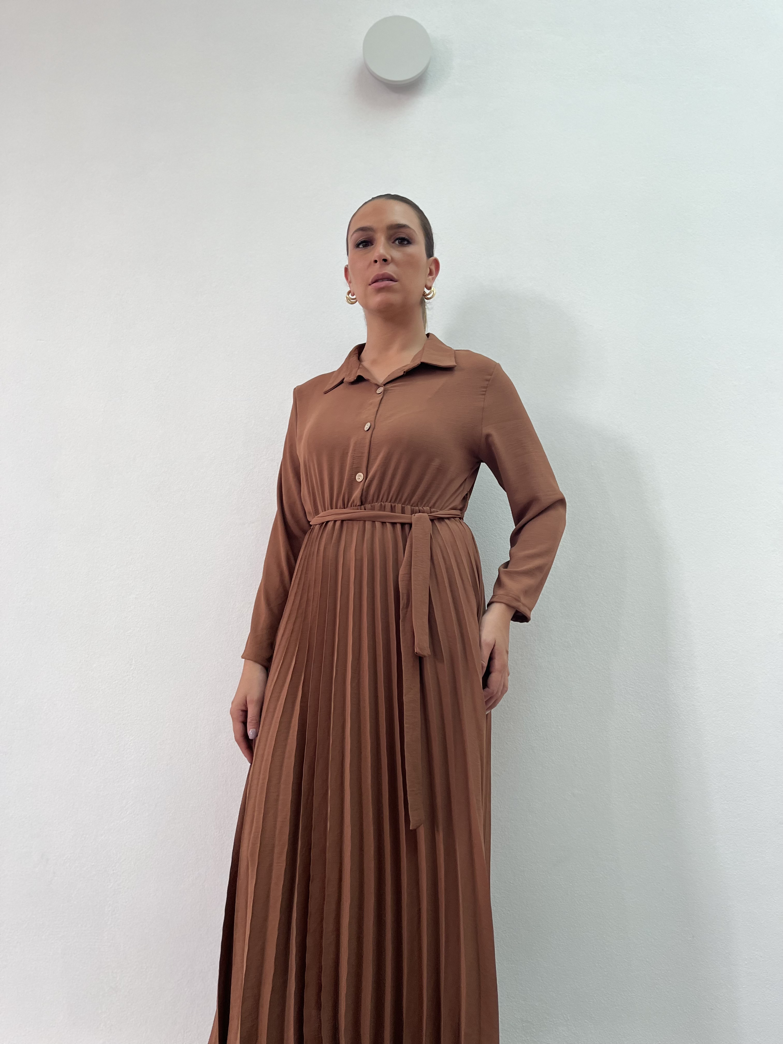 Vestido largo, con cuello y botones. Falda plizada. Talle único.